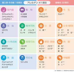 スギやダニなどの吸入系・その他19項目、食物系22項目を調べることが出来ます。